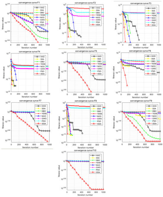 Convergence curves of 10 benchmark functions.