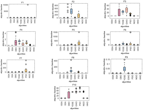 Boxplot analysis was carried out to compare the uniformity performance for all of the considered algorithms [23]. Boxplot analysis tools can effectively graphically represent the empirical distribution of data. Figure 5 shows the boxplots of mean functional assessments for the ISSA, PSO, SSA, DBO, NGO, YDSE, HHO, and GWO. It is clear from Figure 5 that the ISSA is cost-effective in terms of functional evaluation, as it has a smaller range of quartiles and a lower median of the mean functional assessment. On the unimodal test function (F1), the basic functions (F2–F4), the mixed functions (F5–F7), and the combined functions (F8–F10), the box length of the ISSA is smaller than that of the original SSA and other algorithms, indicating that the distribution of the results of the ISSA is more concentrated after running 30 times on these functions. It can be clearly seen from Figure 5 that the ISSA is cost-effective in functional evaluation, because the quartile range of the ISSA is small and its median of average functional evaluation is low. When comparing the algorithms considered according to the standard deviation and success rate, it can be seen from F2, F3, and F10 in Figure 5 that the performance of YDSE and DBO is relatively poor, while the PSO algorithm performs poorly in the test functions F2–F7. It can be seen that the ISSA, SSA, NGO, and HHO perform better in the test function CEC2021.