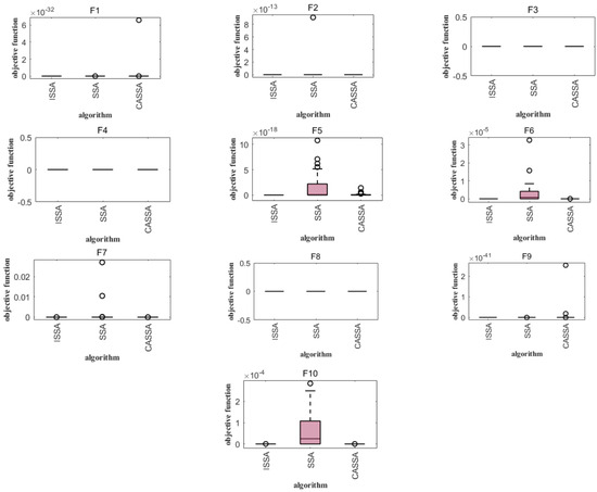 Analyzing Figure 6 and Figure 7, it can be seen that, compared with the same type of SSA and CASSA, the median value obtained by the ISSA is always close to the optimal value of each test function, and the change in the optimal value is minimized after iterative computation; in particular, the distribution of the solutions of the ISSA is more centralized, which demonstrates the superior robustness of the ISSA. The CASSA and ISSA cannot improve their optimization performance for these benchmark functions. In the other tested functions, the ISSA has significantly fewer outlier points than the other two algorithms. In F3, although the other two algorithms do not have outliers, the optimal value found by the ISSA has a smaller range of variation, which proves that it is more stable; in F5, the CASSA outperforms the traditional SSA, with a slightly lower convergence accuracy than the ISSA, but with a lower time complexity. The ISSA improves the convergence speed and search accuracy with very little change in time complexity, and regardless of the single-peak test function (F1), the basis functions (F2–F4), the hybrid functions (F5–F7), and the combination functions (F8–F10), the box lengths of the ISSA algorithm are smaller than those of the original SSA and the CASSA, which indicates that the ISSA has a more centralized distribution of results after 30 runs on these functions. Accordingly, the ISSA is expected to expand the search space of the algorithm, improve the search accuracy, and achieve an effective balance between global search and local optimization.