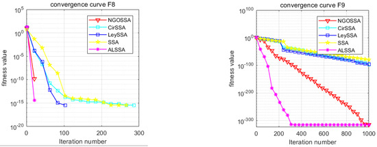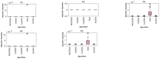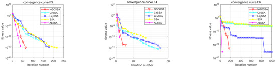 The ISSA is an algorithm with good optimization performance, and its advantages are attributed to a variety of additive mechanisms. However, it is not clear which additive mechanisms play a major role and whether there are certain additive mechanisms that do not work [25]. In order to more accurately understand the roles of various mechanisms, as well as to make the experimental results more credible, we set the CirSSA to contain only the circle mapping mechanism, the LeySSA to contain only the Lévy flight mechanism, the NGOSSA to incorporate the mechanism of the northern hawk algorithm, and the ALSSA to contain only the mechanism of adaptive T-distribution variability. Five standard test functions were selected for optimization of CEC2021 (F3, F4, F6, F8, and F9), and the other parameters were the same as in Section 4.1; the experimental results are shown in the following figure.