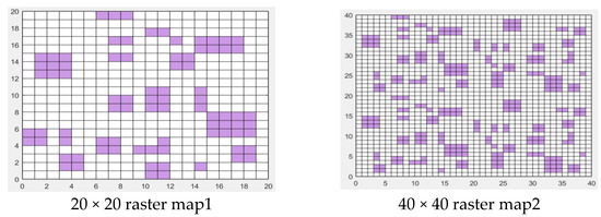 The simulation experiment was carried out using Matlab R2020b software. The computer operating system was Windows 10, Intel (R) Core (TM) i5-4200H CPU @ 2.80GHZ, and the memory was 8 GB. In this study, the planar grid environments with simulation map scales of 20 × 20, 30 × 30, and 40 × 40 were tested.