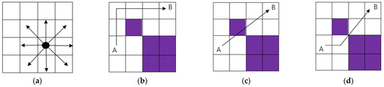 A mobile robot can move on a grid whose coordinates are represented by a central point. The white grid area is the scope of the robot’s autonomous action, allowing passage. The purple grid is the obstacle area, indicating an obstacle on the road. When the robot moves to the grid in the figure, the last direction of action is removed, and it can move towards any target with contact [28], as shown in Figure 11a below. Suppose that the robot encounters obstacles from A to B, bypassing or crossing them during its movement. This can be regarded as a correct and effective path, as shown in Figure 11b,d. If there is contact with an obstacle during movement, it is regarded as an incorrect and invalid path, as shown in Figure 11c.