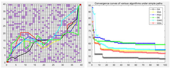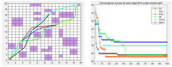 The genetic algorithm (GA), particle swarm optimization (PSO), differential evolution algorithm (DE), gray wolf optimization algorithm (GWO), sparrow search algorithm (SSA), and the proposed improved sparrow search algorithm (ISSA) were used to carry out the global path planning of the mobile robot in the environment model to verify the effectiveness of the ISSA. The GA, PSO, DE, GWO, SSA, and ISSA were used to solve the objective function of the modified path-planning model, finding that more paths are needed. In the simulation experiment, the population size of the GA, PSO, DE, GWO, SSA and ISSA was set to 50, the maximum number of iterations was set to 100, and 30 simulation experiments were carried out. Each individual is a path, as shown in Figure 13, Figure 14, Figure 15, Figure 16 and Figure 17, which detail the path planning of the six algorithms in the five model maps and the iterative convergence curves of the six algorithms.