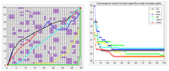 The experimental results show that we can analyze the performance of each algorithm in depth. In the simple map scene with a clear obstacle layout, as shown in Figure 15, various algorithms, such as the GA, PSO, DE, GWO, SSA, and ISSA, can find the best path almost every time they run, despite slight differences in other evaluation indicators. However, in the large map presented in Figure 16, which contains many complex obstacles and traps, the SSA and the DE algorithm need help finding the shortest path, while the ISSA can still find the optimal path. In this case, we need to be aware that it may take more optimization time or more iterations to find the global optimal path in the face of a larger map size. It is worth noting that although the ISSA’s convergence rate is the fastest in Figure 15, it is second only to the GA’s when facing large-scale raster maps (Figure 17). However, considering that the optimal path can be found even in these two maps, we can still assume that the convergence rate of the ISSA is relatively fast.