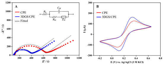 (A) Nyquist plots and (B) CVs of CPE and 3DGS/CPE in a solution of 0.1 M KCl containing 5 mM [Fe(CN)6]3−/4−.