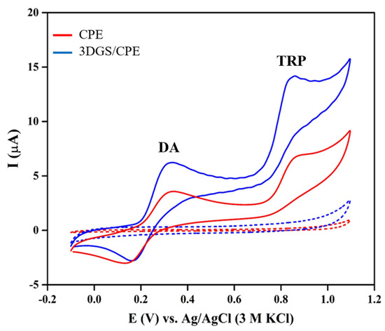 To evaluate the sensing performance of the proposed sensor, CVs of bare CPE and 3DGS/CPE were recorded in 0.1 M phosphate buffer pH 6 in the absence and presence of 80 μM DA and TRP at a scan rate of 0.1 V·s−1 (Figure 2). As shown, 3DGS/CPE facilitates the electrochemical quasi-reversible oxidation of DA to dopamine o-quinone through a two-electron/two-proton process and the subsequent reduction of dopamine o-quinone to DA [23]. The Ipa of DA recorded at CPE and 3DGS/CPE increased from 2.6 μA to 5.3 μA and an anodic peak potential (Epa) shift occurred from 0.33 V to 0.32 V. Following the same trend, for the well-defined irreversible TRP oxidation to 2-amino-3-(5-oxo-3,5-dihydro-2H-indol-3-yl) propionic acid [62], the Ipa rose from 4.62 μA at CPE to 8.75 μA at 3DGS/CPE accompanied by a slight negative shift in the Epa from 0.87 V to 0.84 V. Electrode modification with 3DGS significantly improves the Ipa and decreases the Epa value, which means that oxidation of DA and TRP occurs more readily over the 3DGS/CPE. This confirms the electrocatalytic activity of 3DGS towards DA and TRP oxidation, as well as producing a higher heterogeneous electron transfer rate and enhanced adsorption of organic molecules on the surface of the electrode. Accordingly, the electrochemical features of the 3DGS/CPE are much desirable for the voltametric detection of DA and TRP. Hence, 3DGS/CPE is used as a working electrode for further investigations.