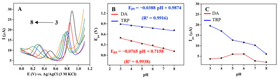 The impact of electrolyte pH on Ipa and Epa of 30 μM DA and TRP at 3DGS/CPE in the pH range of 3–8 using 0.1 M phosphate buffer was investigated by DPV, and the results are shown in Figure 3A. The electrochemical oxidation of DA and TRP occurs through a deprotonation process induced by electron release, which is favorable at higher pH. Hence, the oxidation peak linearly shifts to lower Epa values with increasing pH (Figure 3B). The Ipa of DA reaches the maximum value at pH 6 and gradually decreases as the pH increases (Figure 3C). Based on a study by Li et al. [65] the DA (pKa 8.9) undergoes oxidation to dopamine ortho-quinone, which is relatively stable in an acidic environment. Under acidic conditions, the deprotonation of the amino group is inhibited, which hinders the intramolecular cyclisation process of the product [66]. The slope value of −76 mV from the linear regression equation for DA oxidation indicated that the electron transfer was accompanied by an equal protons’ transfer during the oxidation of DA.