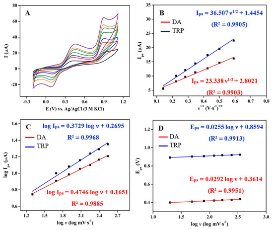 (A) CVs of 3DGS/CPE in 0.1 M phosphate buffer pH 6 containing 100 μM DA and TRP at different scan rates (20–350 mV·s−1); (B) plots of Ipa versus the square root of the scan rate; (C) plots of the logarithm of Ipa versus the logarithm of the scan rate; (D) plots of Epa versus the logarithm of the scan rate at 3DGS/CPE for DA and TRP.