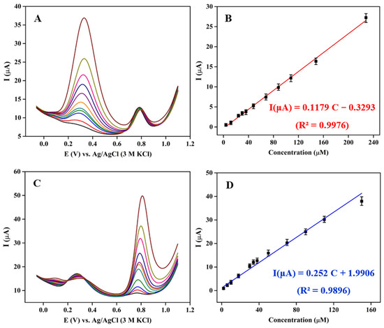 The analytical performance of 3DGS/CPE for the individual quantification of DA and TRP is evaluated using the DPV method. Figure 5A,C show the DPV curves of 0.1 M phosphate buffer pH 6 containing a mixture of DA and TRP, keeping the concentration of one species constant while changing the other analyte. As shown in Figure 5B, a linear dynamic range from 4 to 230 μM concentrations of DA in the presence of 20 μM TRP was obtained. The detection limit (LOD) for DA oxidation at 3DGS/CPE was calculated as low as 1.82 μM from 3 σ/m (σ is the standard deviation of the signal in blank solution, and m is the slope of the calibration curve for lower analyte concentrations) with a sensitivity of 0.9432 μA·cm−2·μM−1.