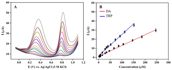 (A) DPV responses of 3DGS/CPE in 0.1 M phosphate buffer pH 6 at a scan rate of 0.1 V·s−1 for simultaneous addition of different concentrations of DA (4–246 μM) and TRP (2–150 μM); (B) calibration curves of measurement of DA and TRP.