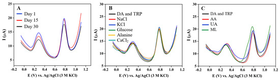 (A) DPVs of 3DGS/CPE in 0.1 M phosphate buffer pH 6 containing 30 μM DA and TRP at a scan rate of 0.1 V·s−1 (recorded within 30 days); Interference test of 30 μM DA and TRP with (B) 100 fold of NaCl, KCl, glucose, alanine, and CaCl2, and (C) 30 μM of AA, UA, and ML.