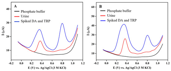 DPVs of 3DGS/CPE in 0.1 M phosphate buffer pH 6 containing human urine sample spiked with (A) 100 μM DA and 50 μM TRP, and (B) 50 μM DA and TRP.