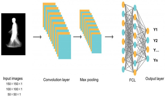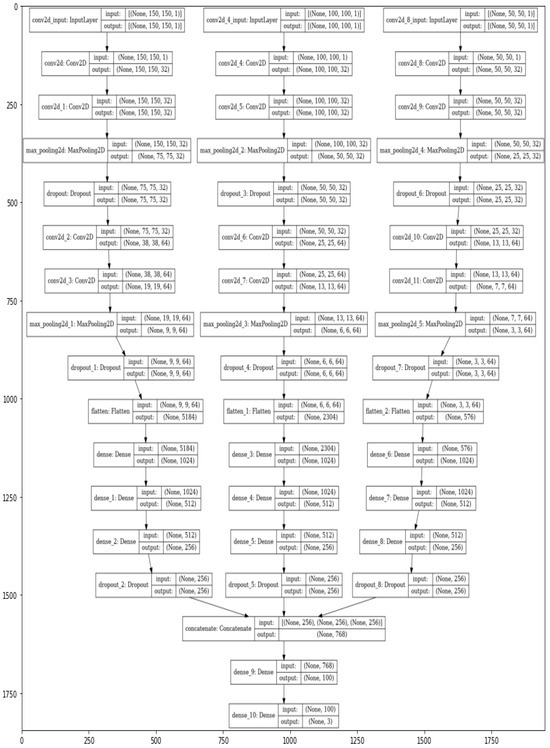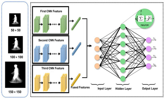 The conceptual design of the proposed Multi-Scaled Deep Convolutional Structure for Punctilious Human Gait Authentication (MSDCS-PHGA) is foundational to understanding the innovative approach this study introduces to gait recognition. The MSDCS-PHGA architecture is engineered to efficiently process and analyze human gait data captured in silhouette form. The gait authentication approach, detailed in Figure 1, employs CNNs to process silhouette images at three scale resolutions: 50 × 50, 100 × 100, and 150 × 150 pixels. Each set of images undergoes processing by a dedicated CNN, with the resulting features fused for classification by a fully connected network comprising an input layer, a dense hidden layer, and an output layer with four neurons.