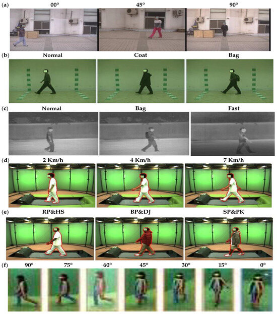 Sample of class label for (a) CASIA (A), (b) CASIA (B), (c) CASIA (C), (d) OU-ISIR (A), (e) OU-ISIR (B), and (f) OU-MVLP datasets.