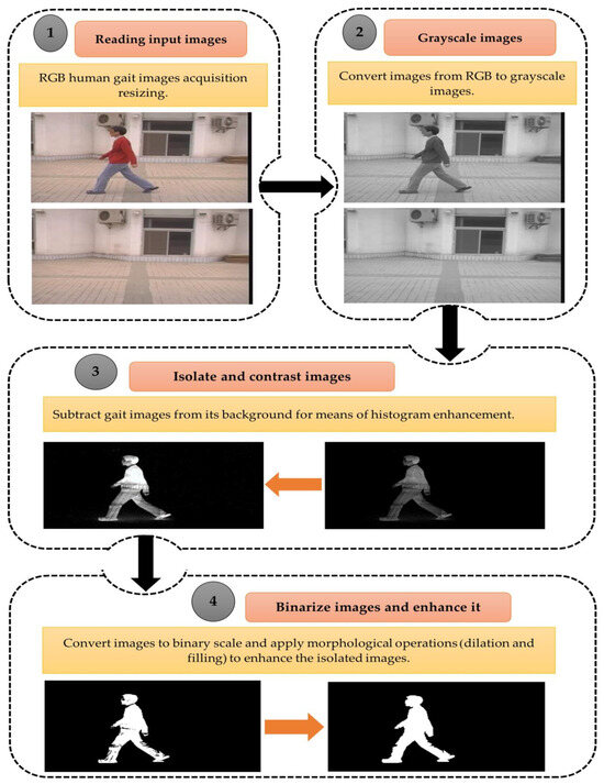 Image preprocessing procedures are used to improve the image quality. Preprocessing aims to reduce noise, remove distortion, and eventually suppress or highlight other attributes essential for subsequent processing, such as segmentation and recognition. Firstly, the gait dataset images were scaled down to three different sizes: 150 × 150, 100 × 100, and 50 × 50, then converted to gray-scaled images to reduce the computational time. In addition, subtract each gait image from its background to obtain isolated images and apply histogram equalization to contrast the resulting image, which is expressed by Equation (1) [47]: