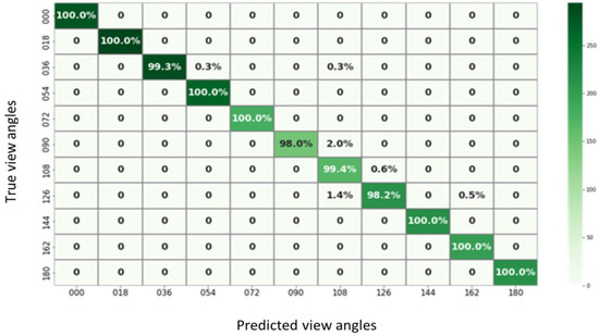 The results indicated the effectiveness of the proposed model. Table 13 highlights that the proposed model outperformed the traditional CNN models in accuracy and training time, achieving 99.9% accuracy within three minutes. Figure 23 complements this by showing the training times for all traditional CNNs. Furthermore, Table 12’s data reveal the superior performance of the proposed model over other existing approaches, achieving a 100% recognition rate across all angles. Notably, for angles within the range of 36°, 108°, and 180°, the model maintained a high recognition rate of 99.0%.