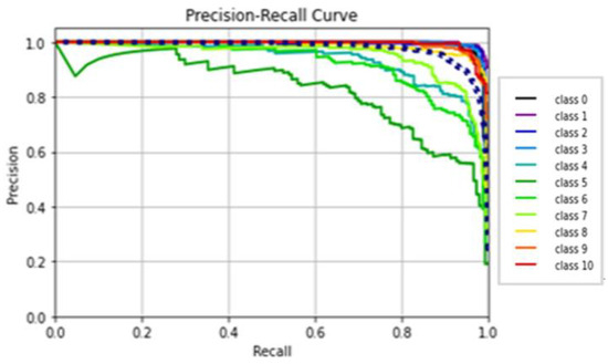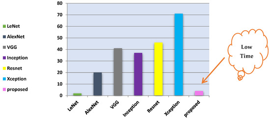 The research findings are divided into two phases. In the first phase, a comparative analysis was conducted between the proposed convolutional neural network (CNN) model and traditional CNNs. Table 13 summarizes the results, showing that ABDGNet achieved precision and accuracy of 99.6% and 99.9%, respectively, within 3 min and 25 s. Figure 23 illustrates the training times for traditional CNN models and the proposed ABDGNet. The proposed model achieved the highest precision of 99.6% and an accuracy of 99.9%, all within a brief training duration of only 3 min and 25 s.