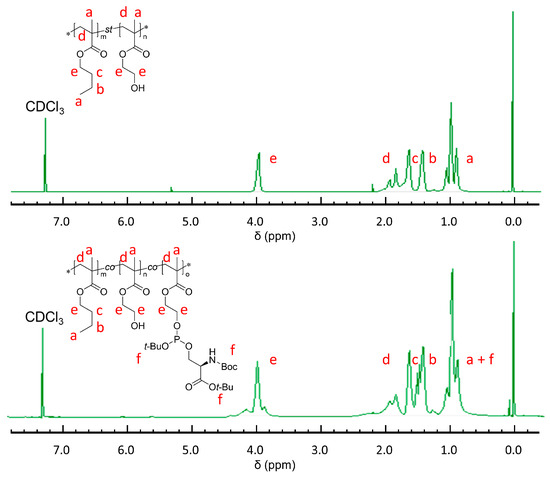 Given the efficiency and hydrophobicity of BMA, alongside the biocompatibility and easy polymerization characteristics of HEMA, we selected these monomers to synthesize the poly (BMA-co-HEMA) copolymer through free radical polymerization as precursor materials for PS particles. This approach to modifying polymer materials with PS groups illustrates a foundational principle for various applications, given their recognized biocompatibility. We safeguarded the amine and acid functional groups of the serine using BOC and tert-butyl protective groups, which can be easily removed under mild acidic conditions without affecting side chains. Furthermore, by adjusting the monomer reaction ratio, we could finely tune the hydrophobicity of the polymers, leveraging the phosphoramidite method. For this research, we conducted the polymerization at a molar ratio of 80 mol% BMA to 20 mol% HEMA, a balance that has been effectively validated in our prior studies. Following the application of the phosphoramidite method to the obtained BMA-HEMA copolymer, the final contents of BMA, HEMA, and MPS were determined to be 76.9, 21.0, and 2.1 mol%, respectively. This composition was confirmed using 1H-NMR spectroscopy (Figure 1).