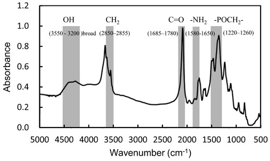 Poly (BMA-co-HEMA-co-MPS) was synthesized by a post-polymerization reaction via the phosphoramidite method with deprotection and oxidation of the phosphatidylserine (PS) using tert-butyl peroxide and trifluoroacetic acid. The poly (BMA-co-HEMA-co-MPS) was successfully synthesized as shown in Figure 4, which was investigated using 1H-NMR spectroscopy. The existence of phosphate moieties on PS-modified polymers was indicated by FTIR characterization in Figure 2. FTIR spectroscopy is a flexible and highly informative technique extensively used for studying the interactions of bilayer membranes at the water–lipid interface [17]. Each vibration of the phospholipid group has a special frequency, absorption maximum, and width. The FTIR spectrum of poly (BMA-co-HEMA-co-MPS) was confirmed in the following regions: phosphate asymmetric stretching vibration PO2− (1220–1260 cm−1), carbonyl ester stretching mode (1685–1780 cm−1), the headgroup (carboxylate antisymmetric stretching band at (1640–1620 cm−1), and NH3+ antisymmetric bending at 1620–1600 cm−1) [18].