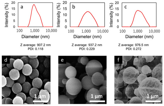 The size distributions of PS particles prepared at concentrations of 2, 4, and 8 mg/mL are shown in Figure 3a–c. The Z-average diameters of the PS particles were found to be 907.2 nm, 937.2 nm, and 976.5 nm, respectively, with corresponding PDIs of 0.118, 0.229, and 0.272. There was a clear trend where the Z-average particle size decreased with lower polymer concentrations, and similarly, the polydispersity index (PDI) also tended to decrease. This suggests that particles were more monodisperse at lower concentrations, indicating a direct correlation between the concentration of the polymer solution and the uniformity of particle sizes produced during the preparation of PS particles.
