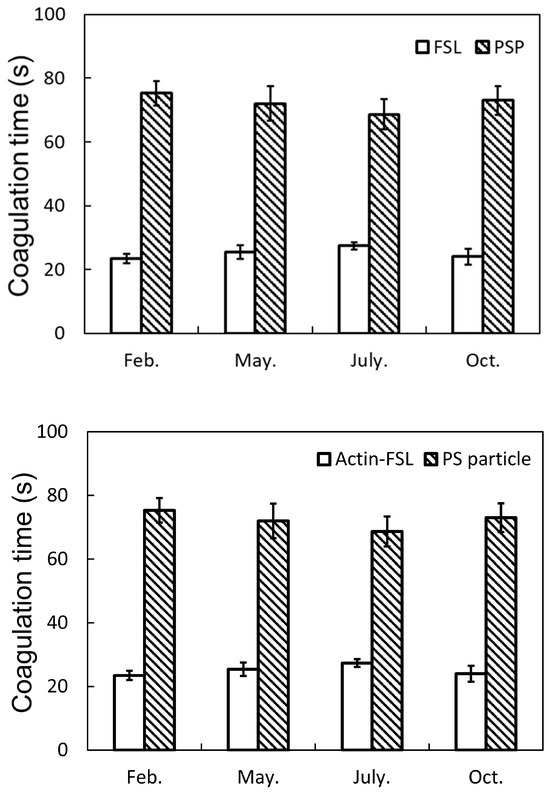 The coagulation tests using Actin-FSL and PS particles were conducted throughout the year, specifically in February, May, July, and October of 2020. This approach aimed to demonstrate the fact that PS particles produce stable results across all seasons and environments (Figure 7).