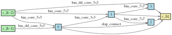 Figure 7 shows the cell structure results according to the different combinations of balancing factors. From the figure, as increases, high-computation operations in the model also increase accordingly, such as 5 × 5 and 7 × 7 convolutions and a lack of skip connections. The number of parameters increases significantly, but there is not much improvement in terms of the performance. However, as increases, the operations in the cell structure are more of a lower computational complexity, such as 3 × 3 and 5 × 5 dilation convolutions, or 3 × 3 convolutions.