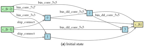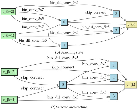 For lightweight models, an optimal network structure is just one part of the equation. Introducing specific data types can also make networks more efficient and lightweight. Binary neural networks (BNNs), which map full-precision data to binary values {−1, 1} [18], are particularly hardware friendly. This attribute not only speeds up processing, but also decreases memory pressure, significantly easing the load on hardware resources during model computation. However, at present, most research on binary networks focuses on adaptations of established full-precision architectures, including ResNet [19] and DenseNet [20]. Notable examples include Bi-Real net [21], binary DenseNet [22], and the Binarized Ghost Module (BGM) [23]. Although Bethge et al. [22] proposed architectural design principles through extensive experimentation and demonstrated their effectiveness in creating efficient new architectures, manually designing an appropriate architecture remains a task that rapidly depletes both resources and time. To address the complexities of designing the architecture of BNNs, researchers have begun to explore the application of NAS in BNNs. Nevertheless, nowadays, most of the existing work on NAS only focuses on real-valued architecture design. Using real-valued NAS strategies in binary domains often results in inadequate convergence. Prior research has validated this issue, highlighting the following principal reasons behind it: