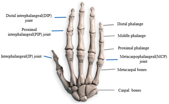 As shown in Figure 1, a normal and healthy human hand consists of 27 bones, including 14 phalanges, 5 metacarpals, and 8 carpals. Notably, the thumb is composed of two phalanges and one metacarpal, while each of the rest of the fingers consists of three phalanges and one metacarpal. According to the distance from the finger joints to the metacarpals, we refer to the phalanx segments from distal to proximal as the distal phalanx, the middle phalanx, and the proximal phalanx, respectively [33]. The distal and middle phalanges, as well as the middle and proximal phalanges, constitute rotating pairs capable of rotation within a plane, thereby contributing one DoF in space for each pair. The proximal phalanx and the metacarpal form a spherical pair, offering two DoFs in space, allowing for rotation in two directions [34]. Consequently, the thumb has five DoFs (two DoFs at the wrist), while each of the other four fingers has four DoFs. Collectively, these components contribute to the 21 DoFs of the whole human hand, crucial for facilitating dexterous manipulation.