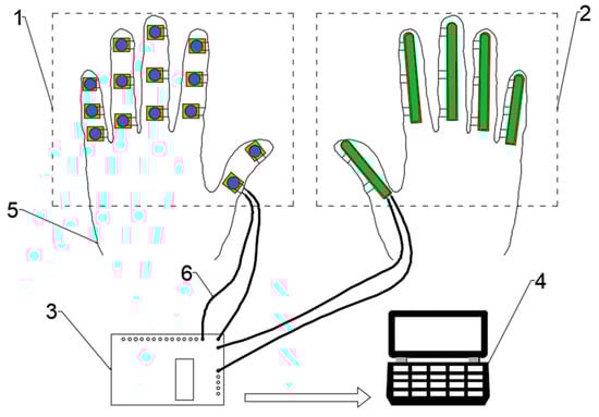 The schematic of the data collection glove. (1) finger pressure collection unit, (2) finger joint bending collection unit, (3) data acquisition board, (4) upper computer, (5) cotton gloves, (6) signal line.