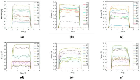 To accurately record the changes in the 14 finger end pressure data points, we labeled the ends of each finger. The thumb, index finger, middle finger, ring finger, and little finger were labeled “Th”, “In”, “Mi”, “Ri”, and “Li” respectively. The distal end, which is farthest from the palm, was labeled as one, the middle end as two, and the proximal end, which is closest to the palm, as three. For the thumb, the distal and proximal ends were labeled as one and two respectively. Using this method, the distal end of the index finger was recorded as In1. All 14 finger ends were numbered in this manner, and the final experimental results are shown in Figure 4.