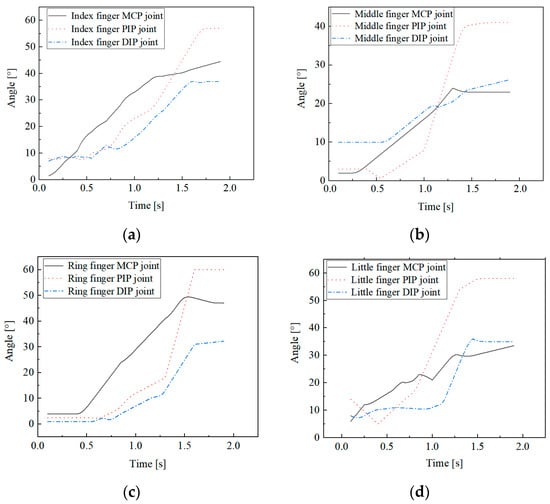 Finger joint angles for grasping a cylinder with ϕ 45 mm. (a) Index finger; (b) middle finger; (c) ring finger; and (d) little finger.