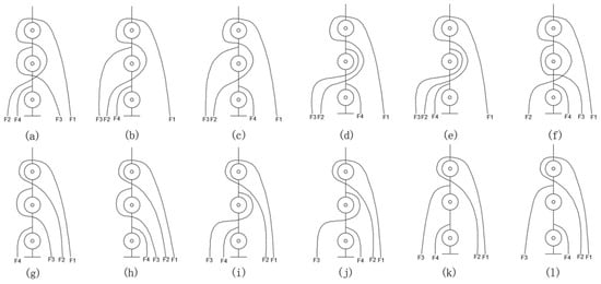 In tendon-driven finger systems, the actuators are usually mounted on a base far away from the finger joints. To drive the distal joints of multi-DoFs fingers, the tendons must pass through multiple finger joints, and the path of the tendon from the base actuator to the driven joint directly affects the tension and speed of the tendon. As shown in Figure 11, for the N + 1 type tendon-driven finger with three DoFs, we designed 12 different tendon path configurations and explored the impact of the tendon path on the performance of the tendon transmission finger.