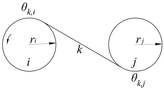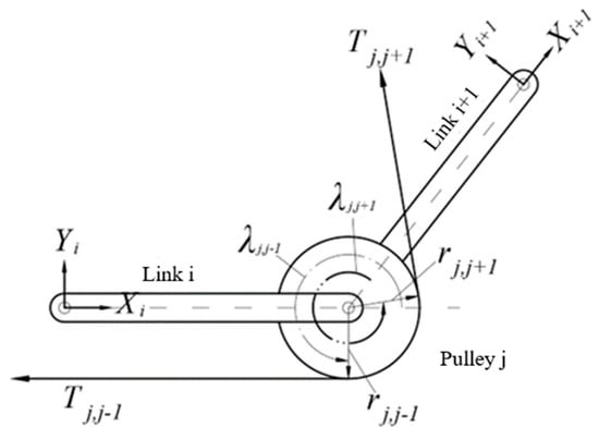 We adopt a stiffness–damping model to mechanically model the tendons. As shown in Figure 8, a typical tendon/pulley model is depicted, where pulley is the driving pulley, and pulley is the driven pulley. The tension in the tendon between pulley and pulley can be expressed as follows: