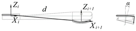 During tendon-driven finger movements, it is possible for the axes of the pulleys at both ends of the linkage to not be parallel. As depicted in Figure 10, there exists a spatial torsion angle α between the axes of the two joints, necessary to introduce a rotation matrix around the X-axis: