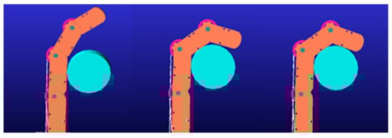 As shown in Figure 12, the stepwise motion of the three joints of the finger is realized using the IF motion function provided by Adams, enabling the three phalanges of the finger to contact the cylinder sequentially. Simulation is conducted to observe the fluctuations in tendon tension during the contact motion for the finger corresponding to the 12 different tendon path configurations.
