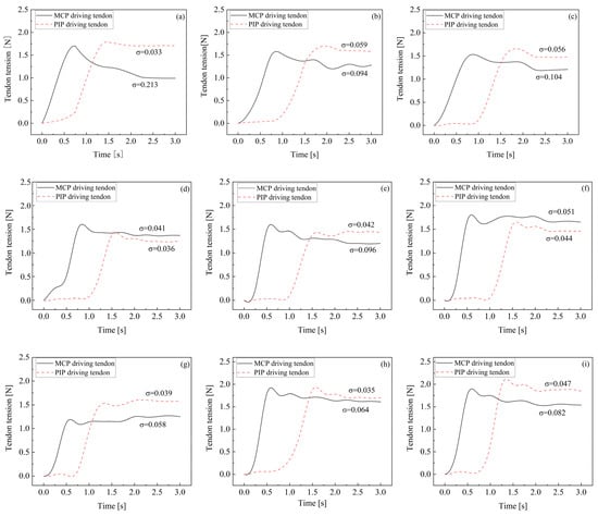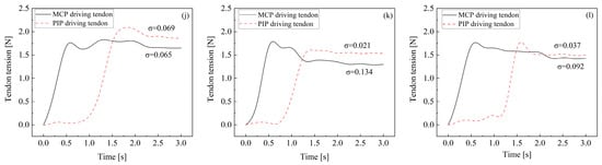 Since the rotation of the DIP joint is the final motion action when a finger contacts an object, its driving tendon tension is generally unaffected by the rotation of other joints. Therefore, the fluctuations in DIP tendon tension are not considered in the simulation. Fluctuations in tendon tension significantly impact the grasping stability of the finger, with smaller fluctuations resulting in better stability. The magnitude of tension fluctuation can be described by comparing the standard deviation of each driving tendon’s tension, after it reaches its peak value, to the average tension. The experimental results are shown in Figure 13.