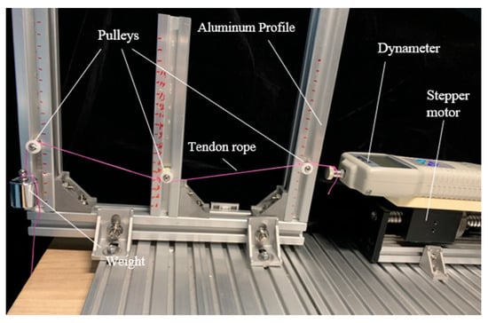 As shown in Figure 16, the experimental platform mainly includes a dynamometer, stepper motor, tendons, weights, pulleys with adjustable mounting positions, and aluminum profiles. The dynamometer is mounted on a lead screw platform. One end of the tendon is tied to the weight, and the other end is tied to the terminal of the dynamometer. The movement of the weights is achieved by the motion of the lead screw platform, and the difference between the value of the dynamometer during the uniform motion of the lead screw platform and the initial gravity of the weight represents the frictional force between the tendon and the pulley. By vertically adjusting the mounting position of the pulley and horizontally manipulating the aluminum profile, the wrap angle of the tendon around the pulley can be modified. Furthermore, altering the weight mass allows for adjustments in tendon tension.