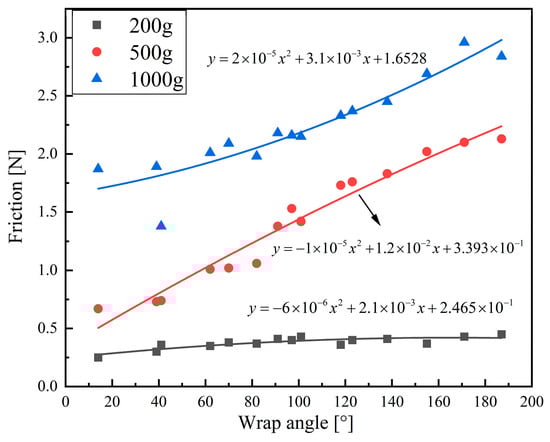 As shown in Figure 17, the relationship between friction force and wrap angle in tendon/pulley system is depicted through a curve graph. Quadratic functions are used to fit the scatter plots of the tendon/pulley friction force against the wrap angle under three different tension conditions. The fitting functions are illustrated in the figure, where the values for the fitting curves under tension conditions of 200 g, 500 g, and 1000 g are 0.718, 0.961, and 0.869, respectively. The linearity between each data point and the fitting curve is relatively good. The results indicate that as the wrap angle of the tendon on the pulley increases, the frictional force between the tendon and the pulley also increases. Moreover, as the tension in the tendon increases, the rate at which the frictional force increases with the wrap angle accelerates. This provides valuable guidance for the subsequent selection of tendon paths in the design of tendon-driven fingers.