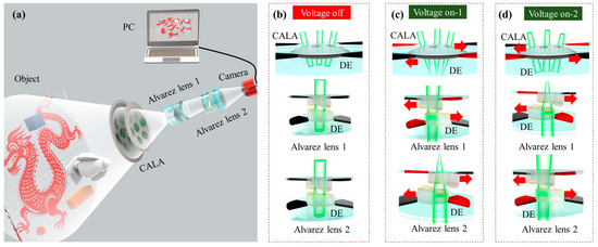 The two-phase plate arrays of the CALA are mounted on the surfaces of two DEs, respectively. Similarly, the two-phase plates of the two Alvarez lenses are also mounted on the surface of two DEs, respectively. Both sides of two fan-shaped areas of the DEs around these phase plates are coated with compliant electrodes. The relative movement of these phase plates perpendicular to the optical axis is used to change the focal lengths of the CALA and the two Alvarez lenses. The movement is realized by the actuation of the DEs. Initially, i.e., when the actuation voltage is off, these phase plates are precisely aligned with each other along the optic axis, as shown in Figure 1b. When the actuation voltage is on, electrostatic attraction of the DE, i.e., Maxwell’s stress, produces radially compressive force directed toward the phase plate at the center and subsequently pulls the phase plate to move laterally towards the edge. Therefore, the focal lengths of the CALA and the two Alvarez lenses can be tuned. By applying driving voltages to different fan-shaped compliant electrodes, two phase plates can be moved in different directions. Therefore, the focal length of the CALA and the two Alvarez lenses can not only be changed by controlling the lateral displacement of the phase plates but can also be varied from a convex lens to a concave lens. As shown in Figure 1c, the CALA acts as a convex lens, the Alvarez lens 1 acts as a concave lens, as well as the Alvarez lens 2 acts as a convex lens. Similarly, as shown in Figure 1d, the CALA acts as a concave lens, and the Alvarez lens 1 acts as a convex lens, and the Alvarez lens 2 acts as a concave lens. Therefore, by adjusting the actuation voltage for the DEs, the proposed system can realize continuous optical zoom imaging. In Figure 1c,d, the red arrow indicates the direction in which the CALA and Alvarez lenses are moving.