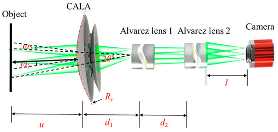 The schematic diagram of the proposed system’s optical path is shown in Figure 2. The object is illuminated by a uniform white LED light source. A virtual relay image is formed between the CALA and the Alvarez lens 1 by the CALA. Then, the image is transferred to the camera by the Alvarez lens 1 and Alvarez lens 2. According to the theory of paraxial optics, the focal power Φ of the central optical channel of the proposed imaging system can be expressed by