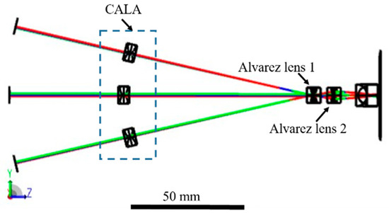 By adjusting the lateral displacement of phase plates, the focal length of the CALA Alvarez lens 1, and Alvarez lens 2 can be changed to achieve continuous variable paraxial magnifications of the proposed system. The relationship between the paraxial magnification and the focal length of the CALA, Alvarez lens 1 and Alvarez lens 2 is shown in Figure 5. When the magnification increases from 0.30 to 0.90, the focal length of the CALA decreases from 150 mm to 60 mm, and that of the Alvarez lens 1 increases from 50 mm to 52 mm. The focal length of the Alvarez lens 2 is slightly changed because it is used to correct aberrations.