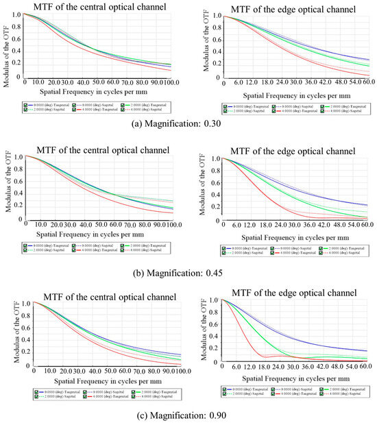 We simulate continuous zoom imaging at variable paraxial magnifications from 0.30 to 0.90. The working distance is set to be 150 mm, and the back working distance is set to be 16 mm. The size of the image sensor is 2/3”, and the total length of the proposed system is 100 mm. We selected the modulation transfer function (MTF) to evaluate the imaging performance of the proposed imaging system. The 3D Layout, MTF of the central optical channel, and MTF of the edge optical channel at the paraxial magnifications of 0.30, 0.45, and 0.90 are shown in Figure 4a–c. The results show that the value of the MTF decreases with increasing magnification. When the paraxial magnification is 0.30, the MTF of the central optical channel is 0.2@80 lp/mm, and that of the edge optical channel is 0.2@42 lp/mm. When the paraxial magnification is 0.45, the MTF of the central optical channel is 0.2@76 lp/mm, and that of the edge optical channel is 0.2@42 lp/mm. When the paraxial magnification is 0.90, the MTF of the central optical channel is 0.2@60 lp/mm, and that of the edge optical channel is 0.2@14 lp/mm.