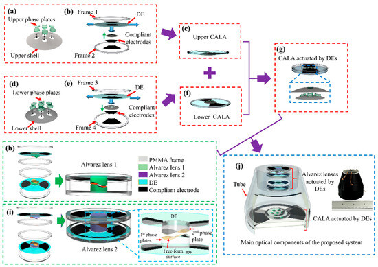 Schematic illustration of the fabrication procedure of the main optical components of the proposed continuous optical zoom compound eye imaging using Alvarez lenses actuated by DEs. (a) The upper-phase plates of the CLAL are precisely assembled into the upper shell. (b) The DE is sandwiched by the two PMMA frames. The top and bottom sides of fan-shaped areas of the DE are coated with compliant electrodes. The upper-phase plates of the CLAL are precisely mounted on the center area of the DE under a microscope. (c) The components are precisely assembled to form the upper CALA. (d–f) The fabrication procedure of the lower CALA actuated by DE. (g) The upper CALA and lower CALA are combined to form the CALA actuated by DEs. (h,i) The fabrication procedure of two Alvarez lenses actuated by DEs. (i) The section view of the main optical components of the proposed continuous optical zoom compound eye imaging using Alvarez lenses actuated by DEs. (j) Section view and photograph of the proposed continuous optical zoom compound eye imaging system.