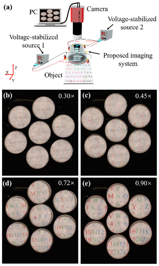 (a) Experimental schematic for verifying the optical zoom capabilities of the proposed imaging system. (b–e) Captured images of the object at different magnifications.