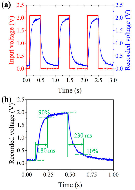 By adjusting the actuation voltage for the DEs, the proposed system can realize continuous optical zoom imaging. To evaluate the dynamic performance, the response time of the proposed imaging system is tested. A collimated 632 nm laser beam is employed as the light resource to illuminate the proposed system. A photodetector (PDA36A-EC, Thorlabs) is placed at the focal plane of the proposed imaging system and is used to obtain the response voltage signal. A function generator (DG1062, RIGOL Technologies, Suzhou, China) provides a periodical square wave input voltage with a period of 1 s, peak-to-peak amplitude of 3.0 V, and a duty cycle of 50%. The input voltage is amplified by a power amplifier (PA1011, RIGOL Technologies) and then applied to actuate the proposed imaging system. When the input voltage is applied to DEs to actuate the CALA and the two Alvarez lenses, the focal length of the proposed imaging system is changed, and then the voltage recorded by the photodetector is varied. The input voltage and the recorded voltage are presented in Figure 8a. The rise time and fall time are defined as the time consumption from the initially recorded voltage to 90% of the maximum recorded voltage and from the maximum recorded voltage to 10% of the maximum recorded voltage. The rise time and fall time of the proposed imaging system are depicted in Figure 8b. The results show that rise and fall times are 180 ms and 230 ms, respectively.