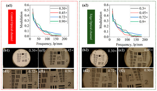 (a1) The modulation and frequency relationship of the central optical channel at different magnifications (a2) The modulation and frequency relationship of the edge optical channel at different magnifications; (b1–f1) The captured images of the central optical channel and edge optical channel (b2–f2) of the USAF 1951 resolution target at different magnifications.