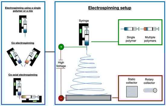 In recent years, significant progress has been made with electrospun vascular grafts (ESVGs). They have evolved from single-layer, single-component structures to multi-layer, multi-component designs. These grafts can be produced by spinning fibres onto a rotating mandrel or by forming a sheet that is subsequently rolled up. The production of tissue-engineered blood vessels by electrospinning may involve the use of a single polymer or a polymer mix, the use of two different polymers by a co-electrospinning process, or the use of two materials electrospun through coaxial systems [112]. Figure 2 illustrates the electrospinning technique and possible variations in the setup to fabricate tissue-engineered blood vessels.
