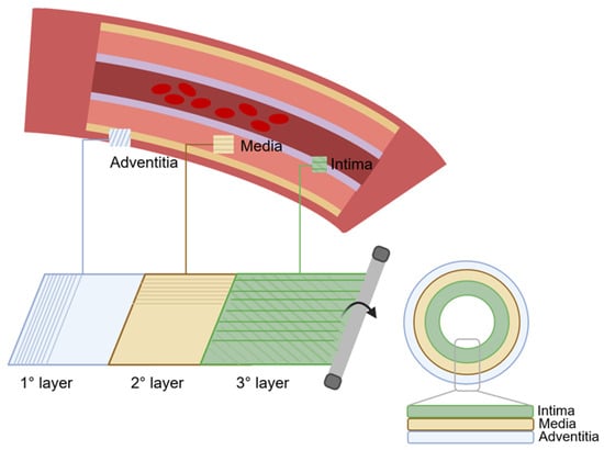 As it appears, vascular tissues represent intricate and constantly changing structures. In the vessel wall, the correct structure, composition, and function of each layer are vital for sustaining vascular homeostasis. The initiation and advancement of cardiovascular disease (CVD) disrupt the normal functioning of each layer, such as nutrient delivery and immune signalling, leading to severe clinical consequences. It is clear that the complexity of native blood vessels should be considered during vascular tissue engineering, as considering the recreation of all layers of the arterial wall, or at least the inner and middle layers, and their properties would be beneficial in obtaining a functional vascular substitute and achieving a good degree of success.