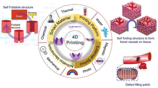 - Zeenat, L.; Zolfagharian, A.; Sriya, Y.; Sasikumar, S.; Bodaghi, M.; Pati, F. 4D Printing for Vascular Tissue Engineering: Progress and Challenges. Adv. Mater. Technol. 2023, 8, 2300200. [Google Scholar] [CrossRef]