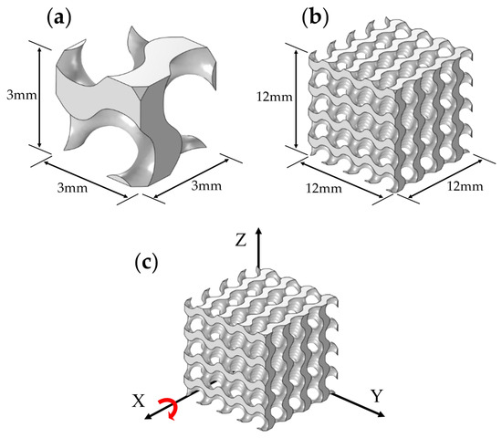 The model of the TPMS structures: (a) cell size; (b) the size of the 4 × 4 × 4 model; (c) schematic diagram of changing the load-bearing angle of the Gyroid structure along the X-axis. The red arrow indicates the position of the axis of rotation.